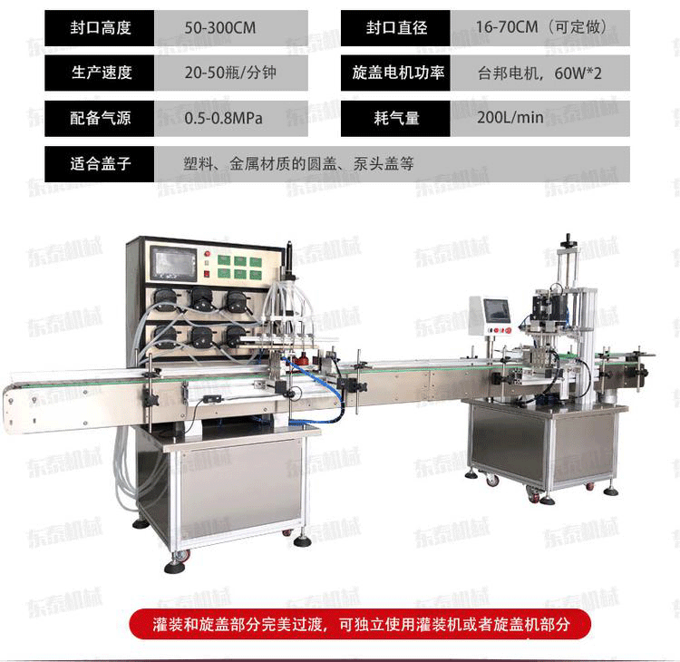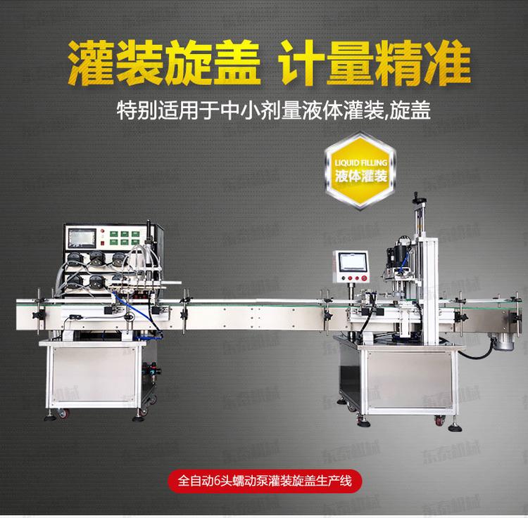 消毒水液體灌裝旋蓋線是我司在吸收先進技術的基礎上研發的一款新型自動生產線,特別適用于中小劑量液體灌裝和各種圓形瓶蓋,泵頭蓋,噴頭蓋,鴨嘴蓋,噴槍的鎖蓋。同時適用各種材質圓形、異形瓶,各種規格的瓶子灌裝旋蓋。微電腦自吸蠕動泵自動定量、氣動感應定位灌裝(根據需要也可不選配升降灌裝結構)等。具有計量精準、灌裝平穩、操作簡單、高速分裝、旋蓋等優點。廣泛應用于醫藥、日化、飲料,酒水等行業