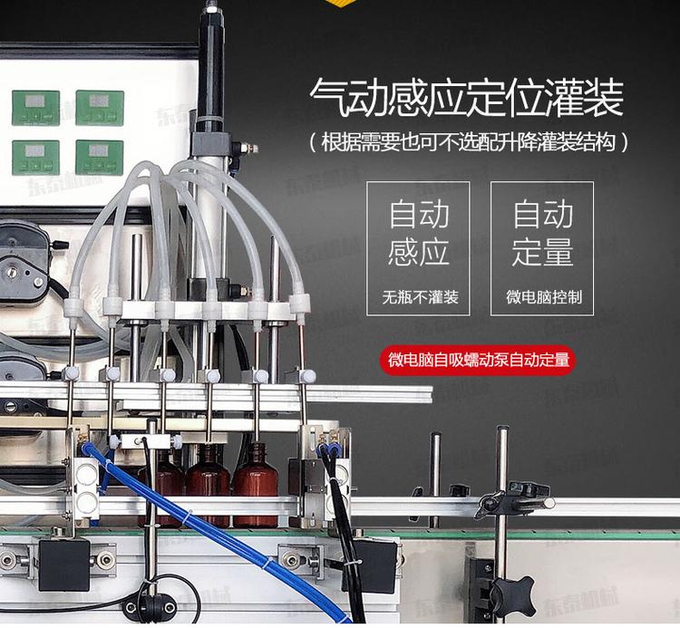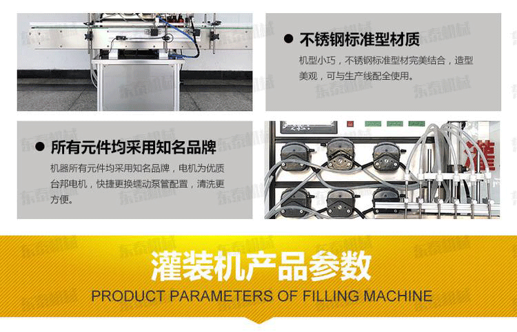 1、消毒水液體灌裝旋蓋線所有元件均采用,電機為優質臺邦電機,快捷更換蠕動泵管配置,清洗更方便。機身為鋁合金+不銹鋼。本機操作簡單、直觀方便,自動感應,無瓶不灌裝,灌裝和旋蓋部分過渡,可獨立使用灌裝機或者旋蓋機部分,另旋蓋機標配自動分瓶功能,方便小瓶旋蓋,性能穩定,可靠,效率高。