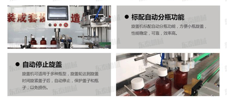 4、旋蓋機可適用于多種瓶型,旋蓋輪達到旋蓋時間旋緊蓋子后,自動停止,保護蓋子和瓶子,以免損傷。
